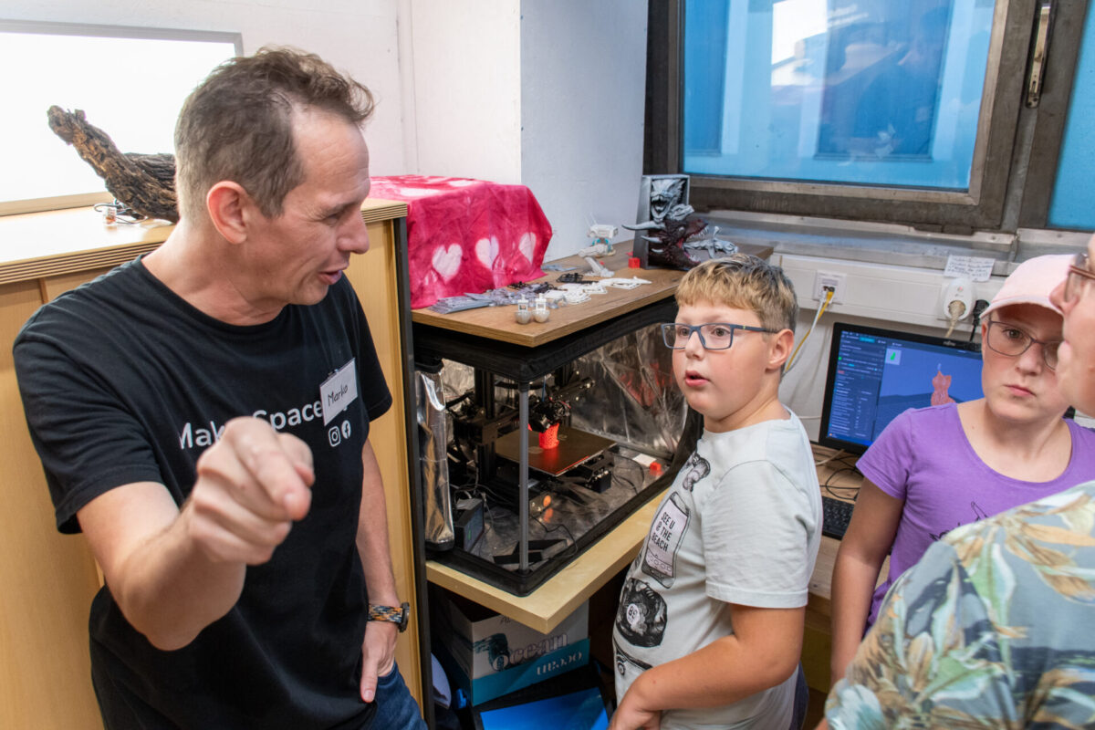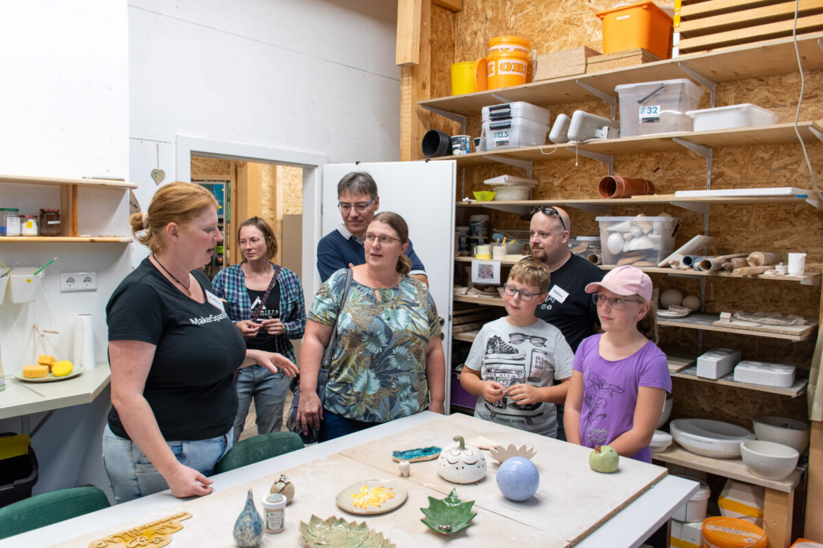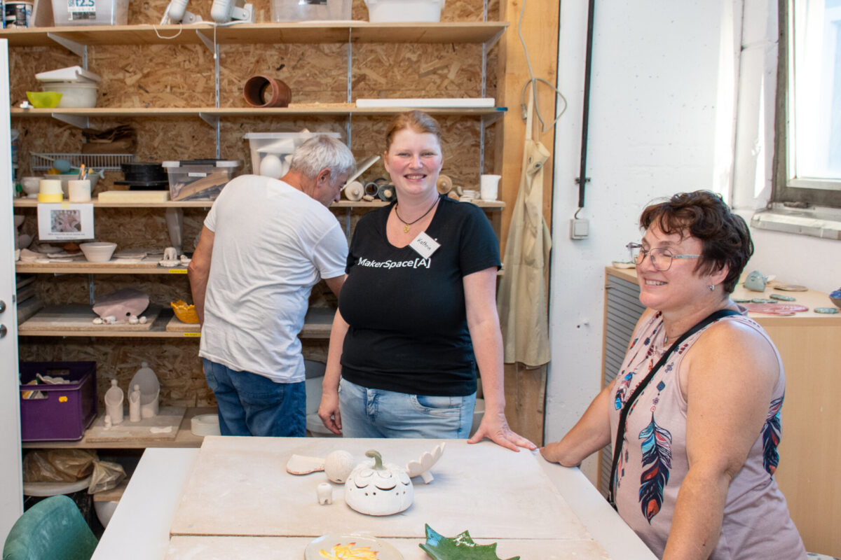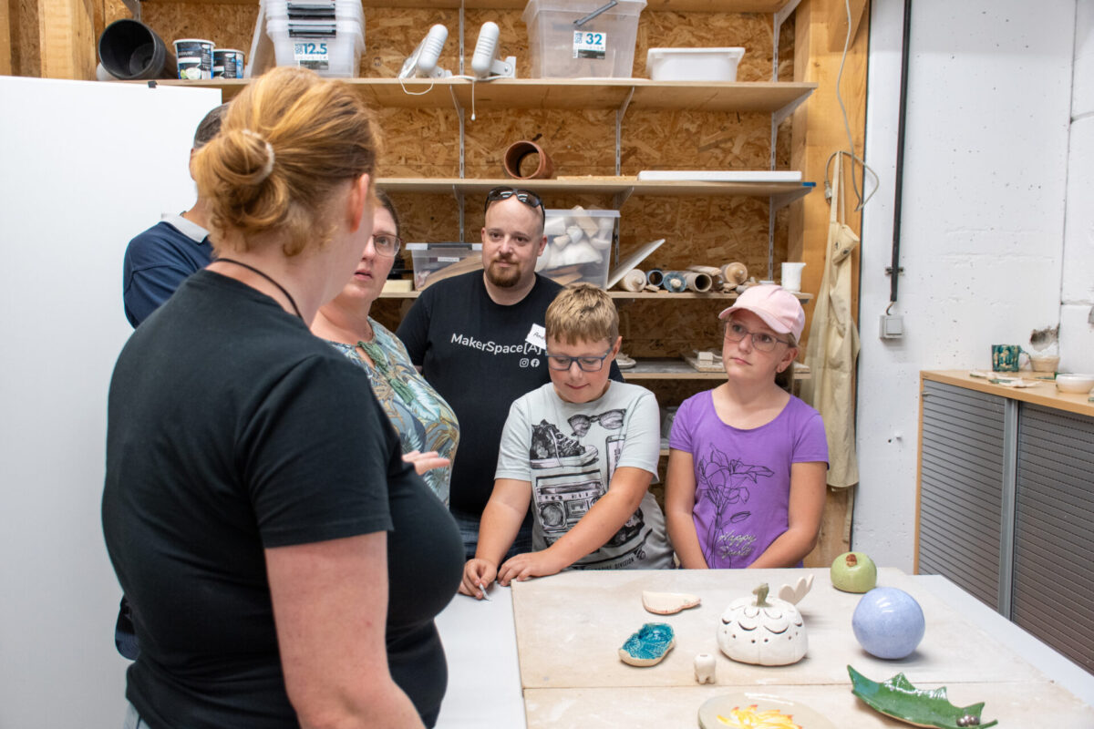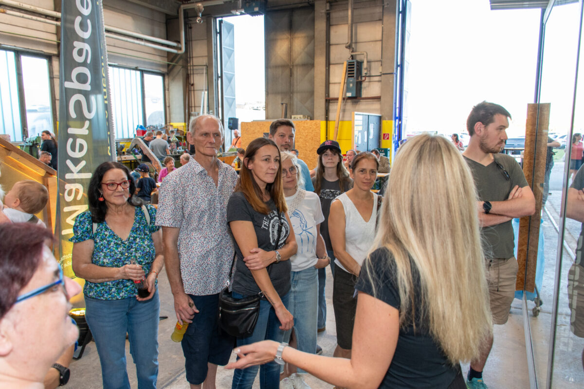 Den ganzen Abend über führten Tamara Mader und Roland Schuller unermüdlich Gruppen durch unsere vielfältigen Bereiche – von der Holz- und Metallwerkstatt über die Keramik bis hin zum Elektroniklabor. In jeder Ecke gab es etwas zu entdecken, denn unsere Bereichssprecher präsentierten mit Leidenschaft, was in ihrem jeweiligen Reich alles möglich ist. Man konnte nicht nur zusehen, sondern oft auch selbst Hand anlegen und spüren, wie aus einer Idee Wirklichkeit wird.