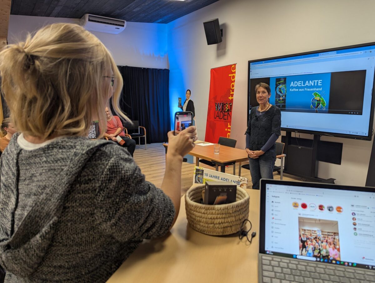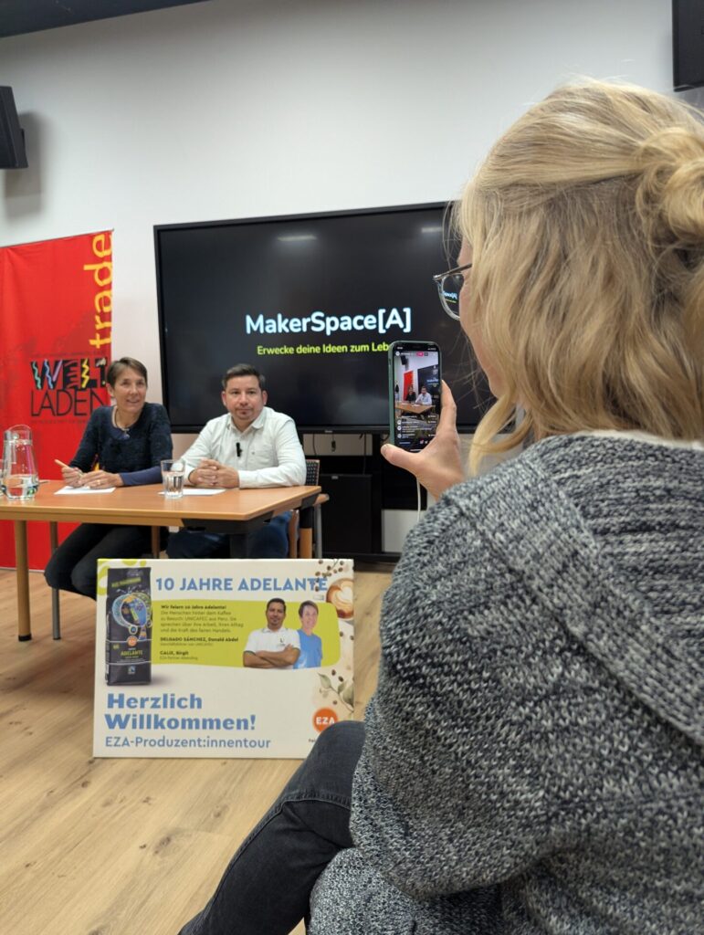 Donald Delgado Sánchez, Vertreter der peruanischen Kaffeekooperative UNICAFEC, gab uns einen direkten und authentischen Einblick in die Lebens- und Arbeitsbedingungen der Kaffeebauern. Seine Ausführungen auf Spanisch wurden von Birgit Caux (EZA Partner Attending) einfühlsam ins Deutsche übersetzt. In der anschließenden, lebhaften Diskussion wurde deutlich, vor welchen Herausforderungen die Produzent:innen stehen und welch entscheidende Rolle der faire Handel als Antwort darauf spielt.