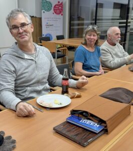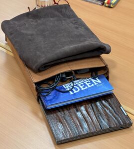 Wir nutzen Rolands Expertise, setzen uns zusammen und gestalten unsere eigene Laptoptasche. Roland unterstützt uns bei der Anpassung des Schnittes, beim Zuschneiden mit dem Laser und beim Nähen.